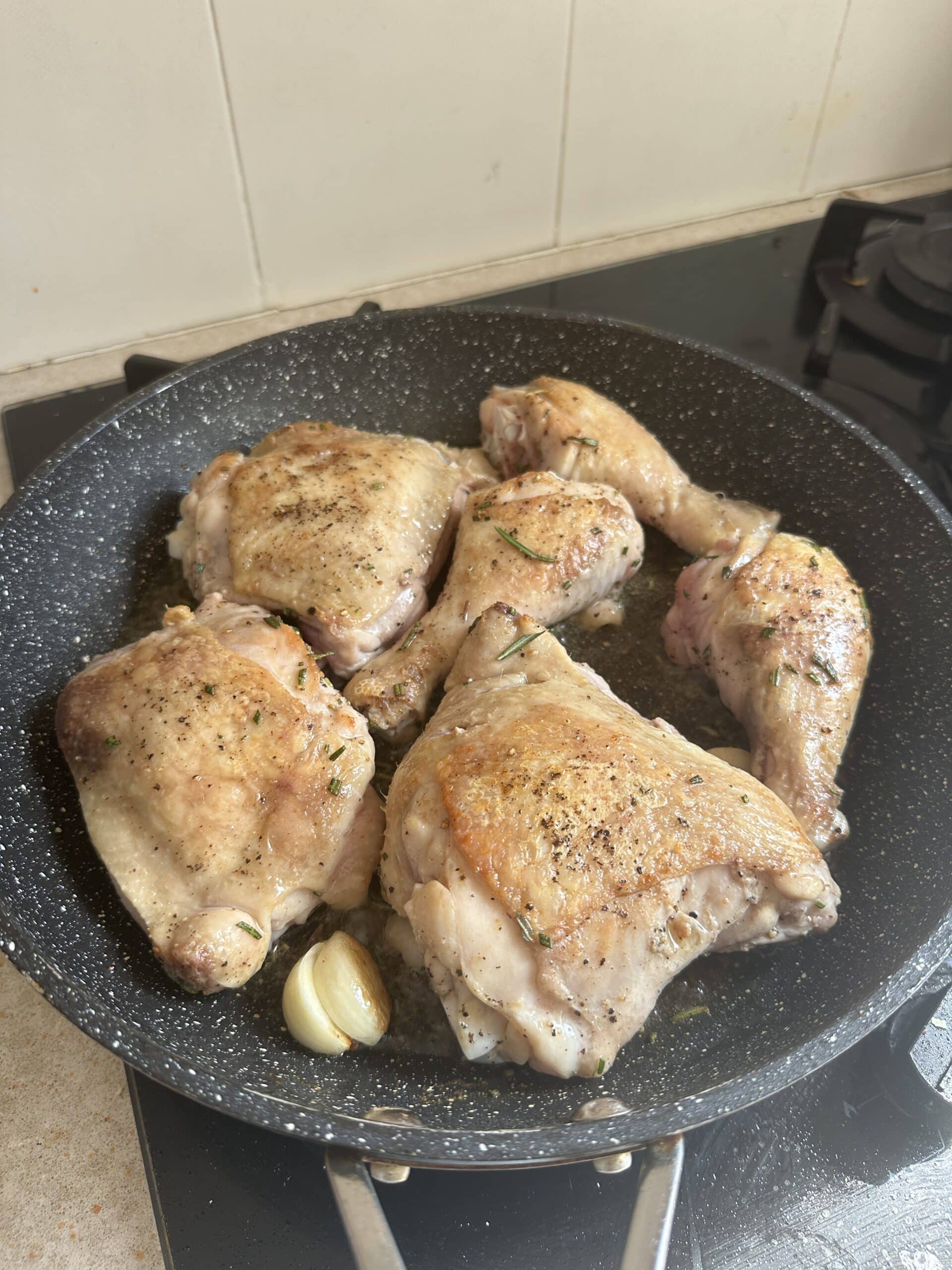 - מתבלים את העוף במלח ופלפל. מחממים מחבת רחבה עם שמן זית על חום בינוני- גבוה. צורבים את העוף כשהעור כלפי מטה. מתבלים ברוזמרין ושום. כשהצבע של העור צרוב הופכים ומוסיפים את היין הלבן והחומץ, מערבבים לסירוגין, מוסיפים את האנשובי ואת הקמח(אפשר גם לקחת קצת מהרוטב ולערבב בכלי עם הקמח ולהוסיף) כאשר אין ריח של אלכוהול מכסים במכסה ל20 דק׳. מנמיכים את האש לנמוכה- בינונית. פותחים את המכסה מוסיפים זיתים. מתקנים תיבול עם מלח.