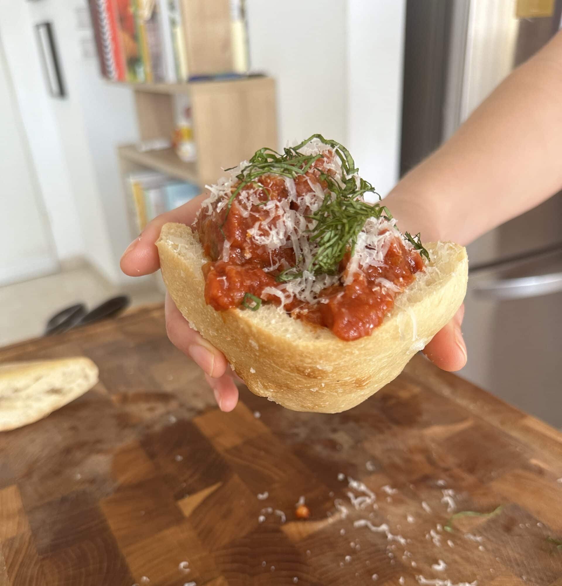 טראפיצינו היא הכלאה בין שתי מילים איטלקיות: טרמצינו – סנדוויץ והמילה פיצה. בעצם בצק פיצה שהוא סוג של סנדוויץ. את הבצק אנחנו אופים בצורת ריבועים, חותכים אותם באלכסון פותחים את הכיס וממלאים בתבשיל רומאי. את המאכל הזה המציא סטפנו קלגרי, שף רומאי שבכלל עבד כדייל אוויר, התאהב בפיצות ובסנדווצ׳ים והחליט לשלב בין השניים. לרשת יש סניפים בעיקר באיטליה וסניף אחד בניו יורק. התבשיל שהכי חקוק לי בפה היה העוף אבל עדיין לא הסתפקתי רק בו. החלטתי להכין כדורי בשר קטנים שקצת מזכירים את המנה הזאת. קלאסי כן, ולא מחדש אולי אבל זה כל כך טעים. הרוטב שנספג בתוך הלחם והקשה ששומר על כל המיצים והקריספיות. זה כל מה שרציתי ובצדק.