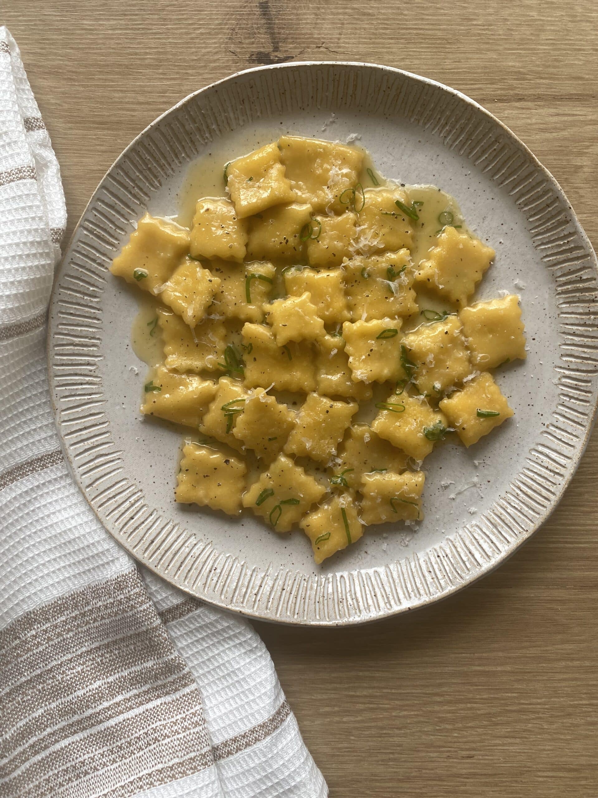אחד המתכונים הכי מאולתרים שהכנתי הוא ספוליה לורדה. פירוש השם הוא דף מלוכלך והוא בעצם יריעת פסטה גדולה שמורחים על מחציתה מלית ריקוטה. את היריעת הבצק הריקה מכסים על זו שמרחנו, מחוררים במזלג ועוברים עם גלגלת זיגזג וחותכים לצורת קוביות קטנות. תמיד כשנשארת לי מלית מסדנה או כל מלית טעימה שהיא אני מכינה את הפסטה הזאת. מדובר בפסטה טעימה ועדינה שלרוב מכינים בתוך ציר מרק אבל אני אוהבת עם רוטב חמאתי כיפי. אפשר לשחק עם הרוטב כל הזמן והפסטה נהיית מוכנה תוך חצי דקה מרוב שהיא קטנה ודקה. בתיה ואני תיכננו לבשל ולצלם יחד כבר לא מעט זמן. הוחלט על פסטה והיה לי ברור שאם יש צורת פסטה שתתאים גם עבורה זאת זאת. הריבועים, הסימטריות והאסתטיקה הם קווים תואמים גם אצלה וגם אצלי ובזכות יום מאוד מהנה אצלה הכנו ביחד את הפסטה הזאת עם רוטב טעים ומאולתר ועפנו על התוצאה.