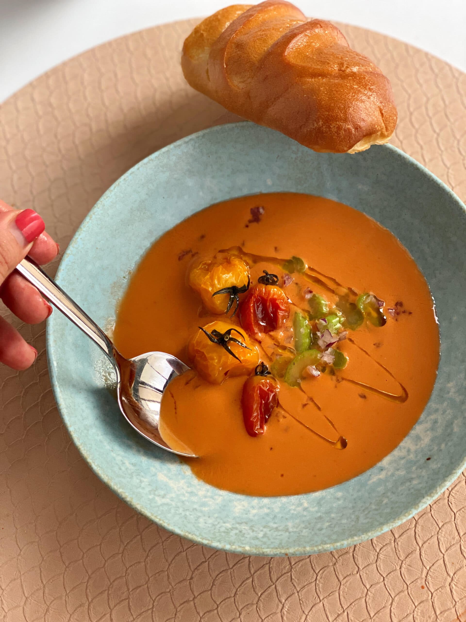 את הגספאצ'ואים הבאים התחלתי לאכול במדריד בתור אוכל צוות. היו כל מיני טופינגס מעל וזה כל כך נחמד לפני ארוחה, שלא תבינו אותי לא נכון זו לא ארוחה מלאה אבל זה בדיוק הדבר הזה שכולנו אוהבים הנוזל הזה של הסלט.