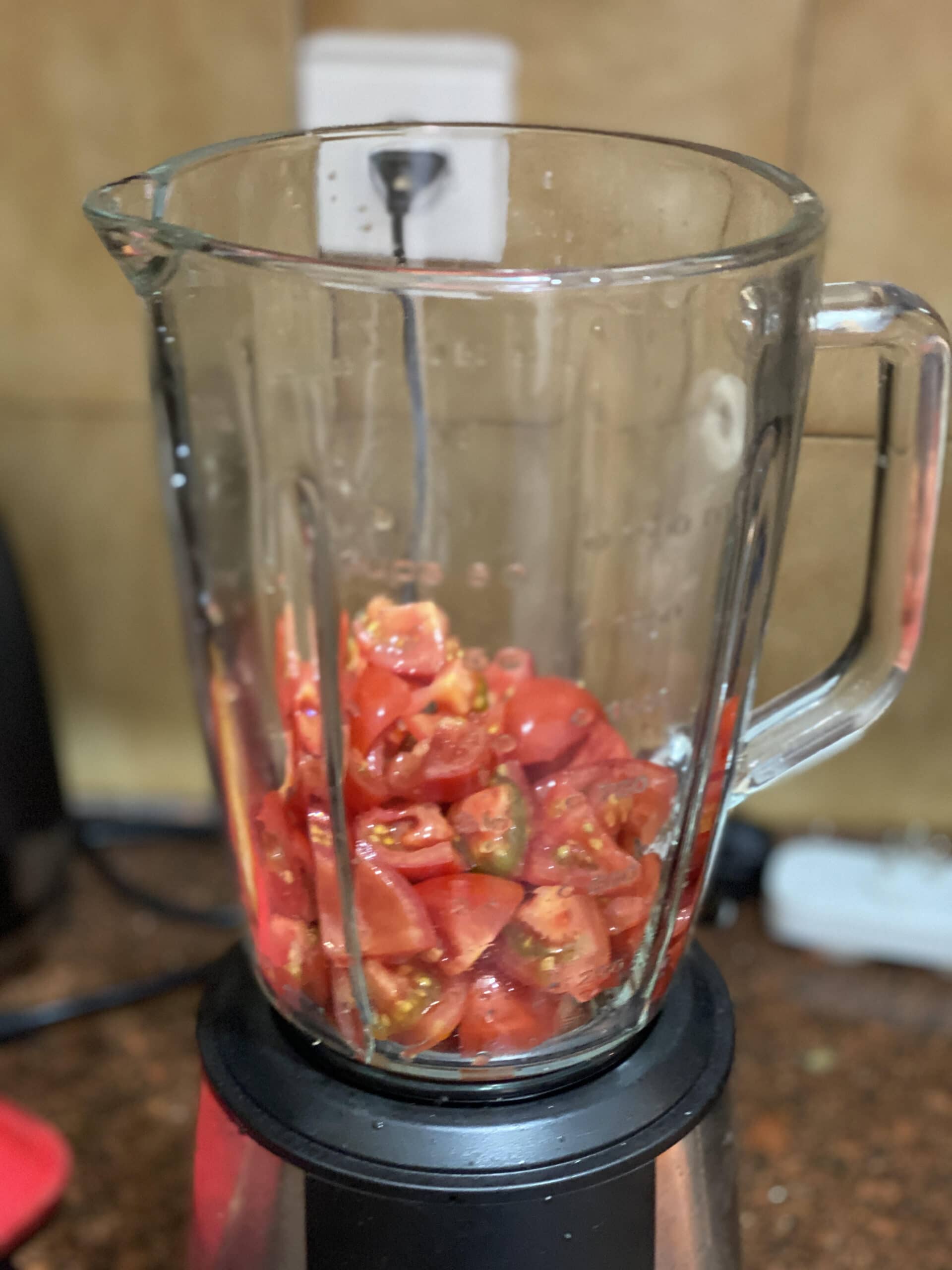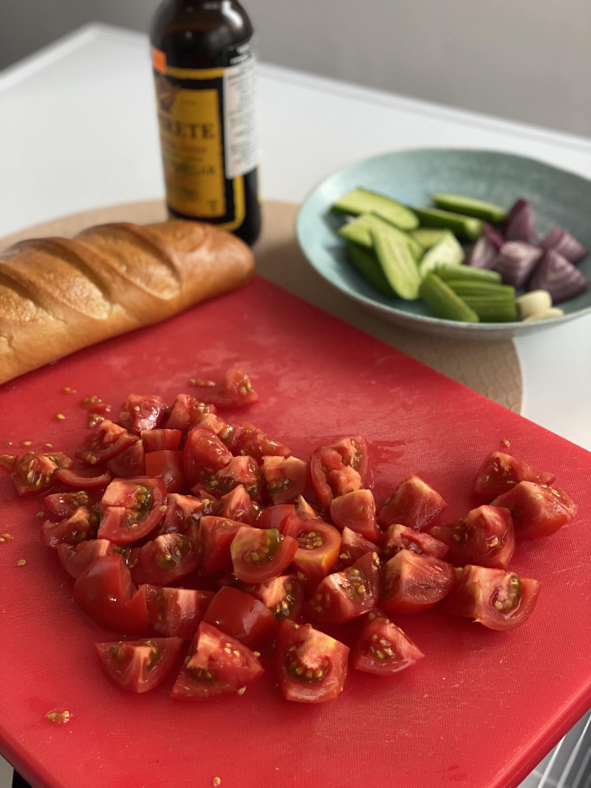 - חותכים את העגבניות, את השום חוצים, את המלפפון חותכים לריבועים, את הסלרי למקטעים ומעבירים את כל המרכיבים לבלנדר כולל הלחם. מוסיפים את החומץ שרי ואת השמן זית וטוחנים כדקה.
