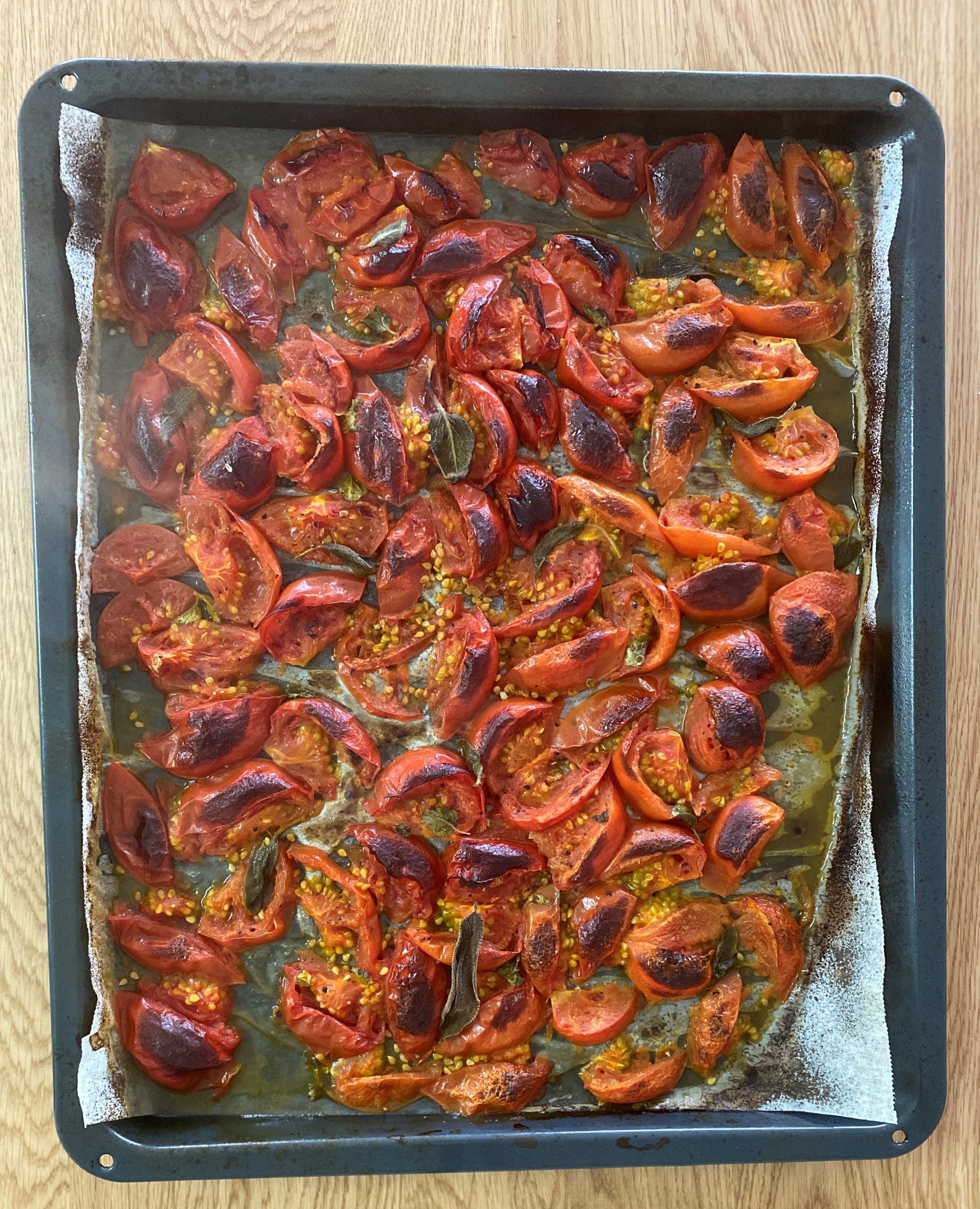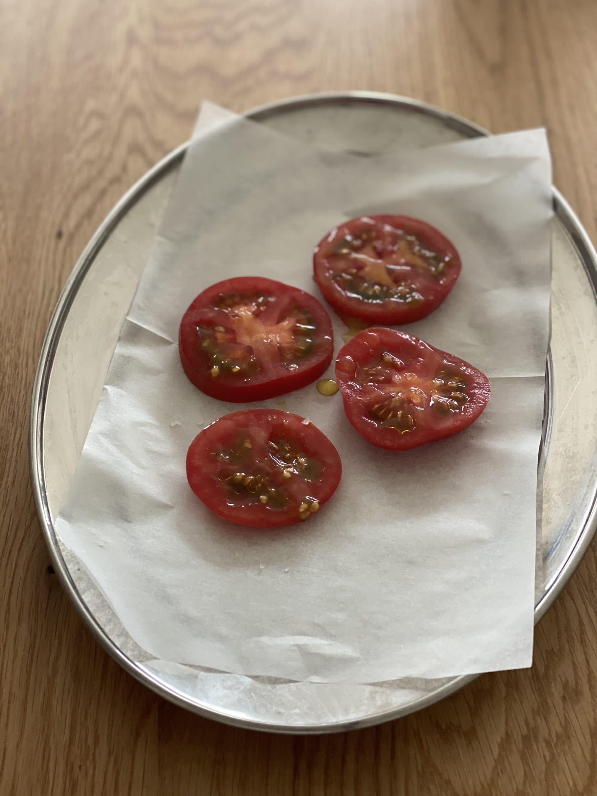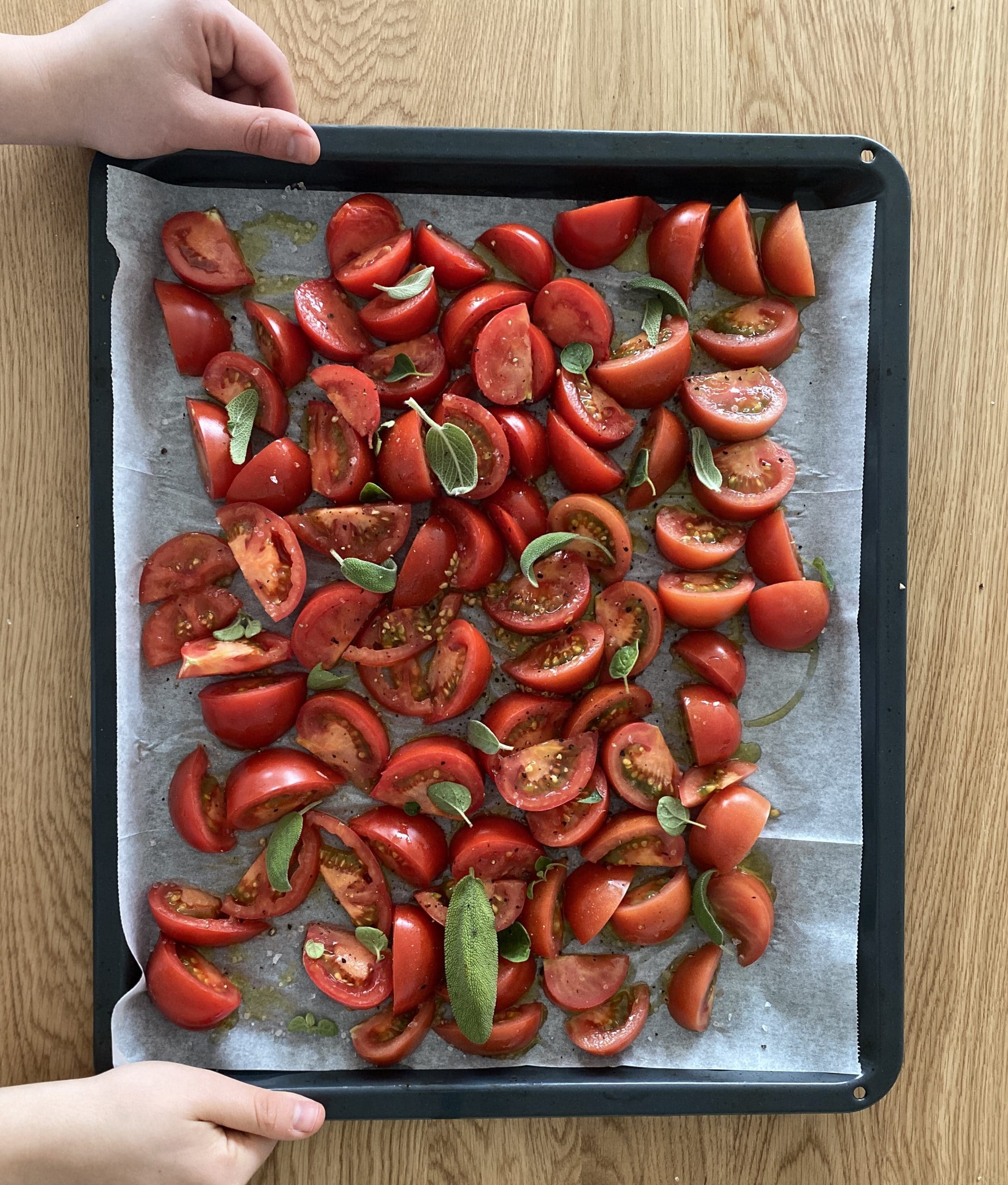 - מחממים תנור ל250 מעלות חום עליון וחום תחתון. חוצים את העגבניות ואז מחלקים כל חצי ל-2 או 3 פלחים ומסדרים במגש אפייה עם נייר. מפזרים את המלח ומזלפים את השמן. מכניסים לתנור כאשר הוא חם ל40-45 דק' או עד שהעגבניות השחימו.