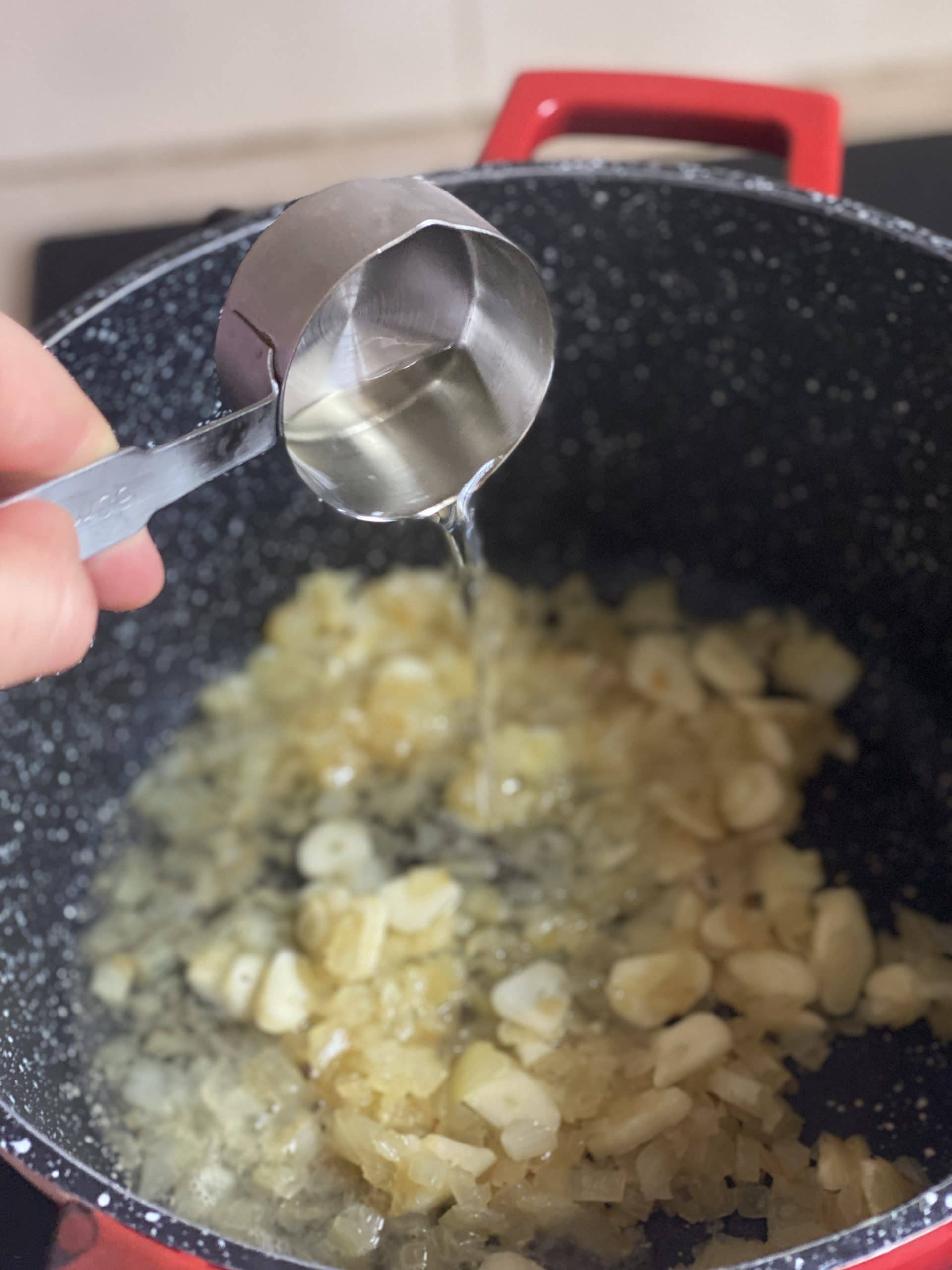 - בשלב זה יש להוסיף את השום הפרוס ולערבב עוד 2-3 דק'. לאחר מכן מוסיפים את היין הלבן ומערבבים במשך מס' דקות עד שהאלכוהול מתנדף. יש ריח חזק של אלכוהול וחשוב שהוא יצא.