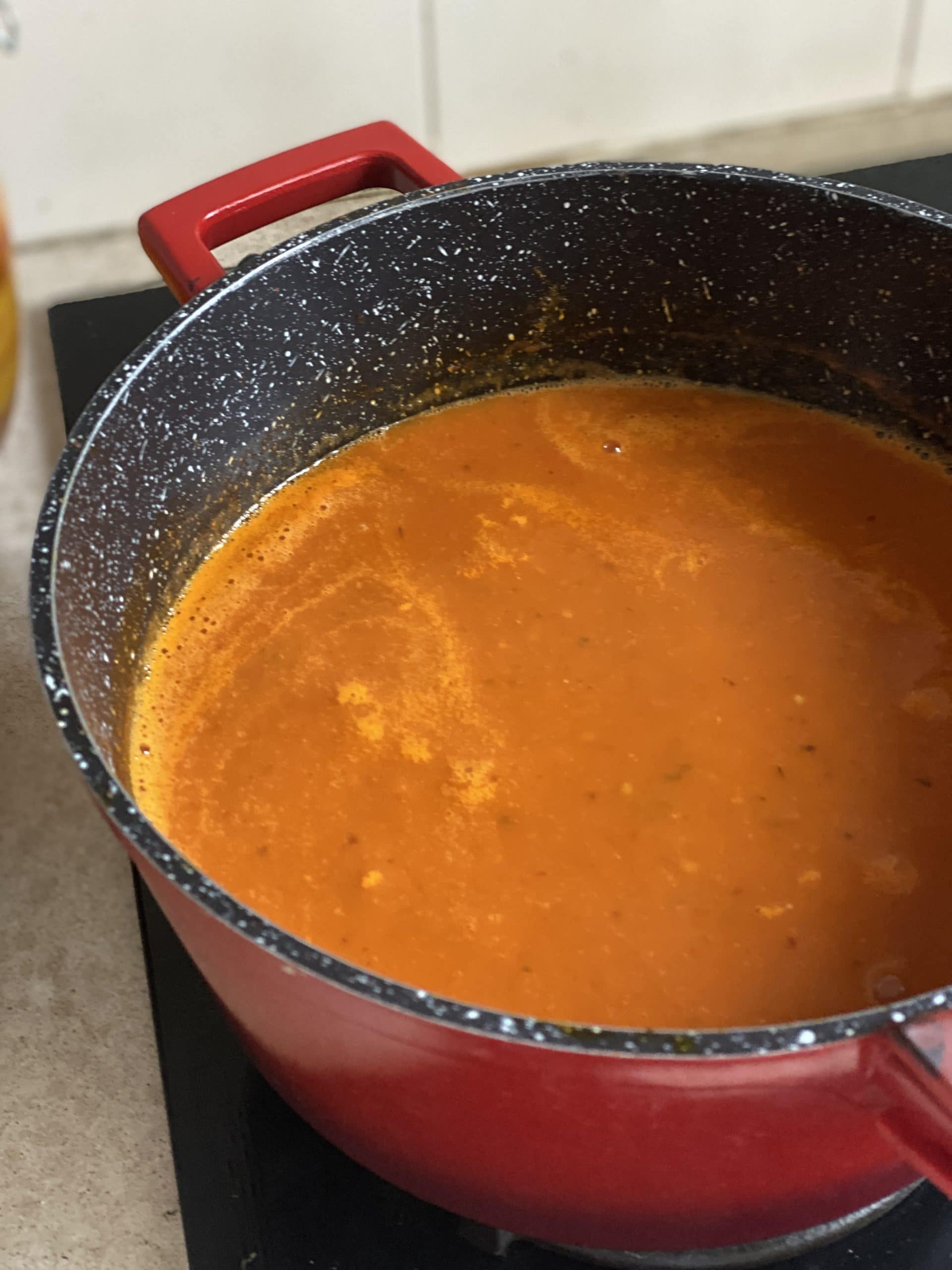 - ברגע שהעגבניות בתנור מוכנות מוסיפים אותן בזהירות עם לקקן, כולל כל הנוזלים אל תוך הסיר ומערבבים. מוסיפים פחית שימורים של עגבניות מרוסקות וליטר מים ונביא לרתיחה במשך מספר דקות.