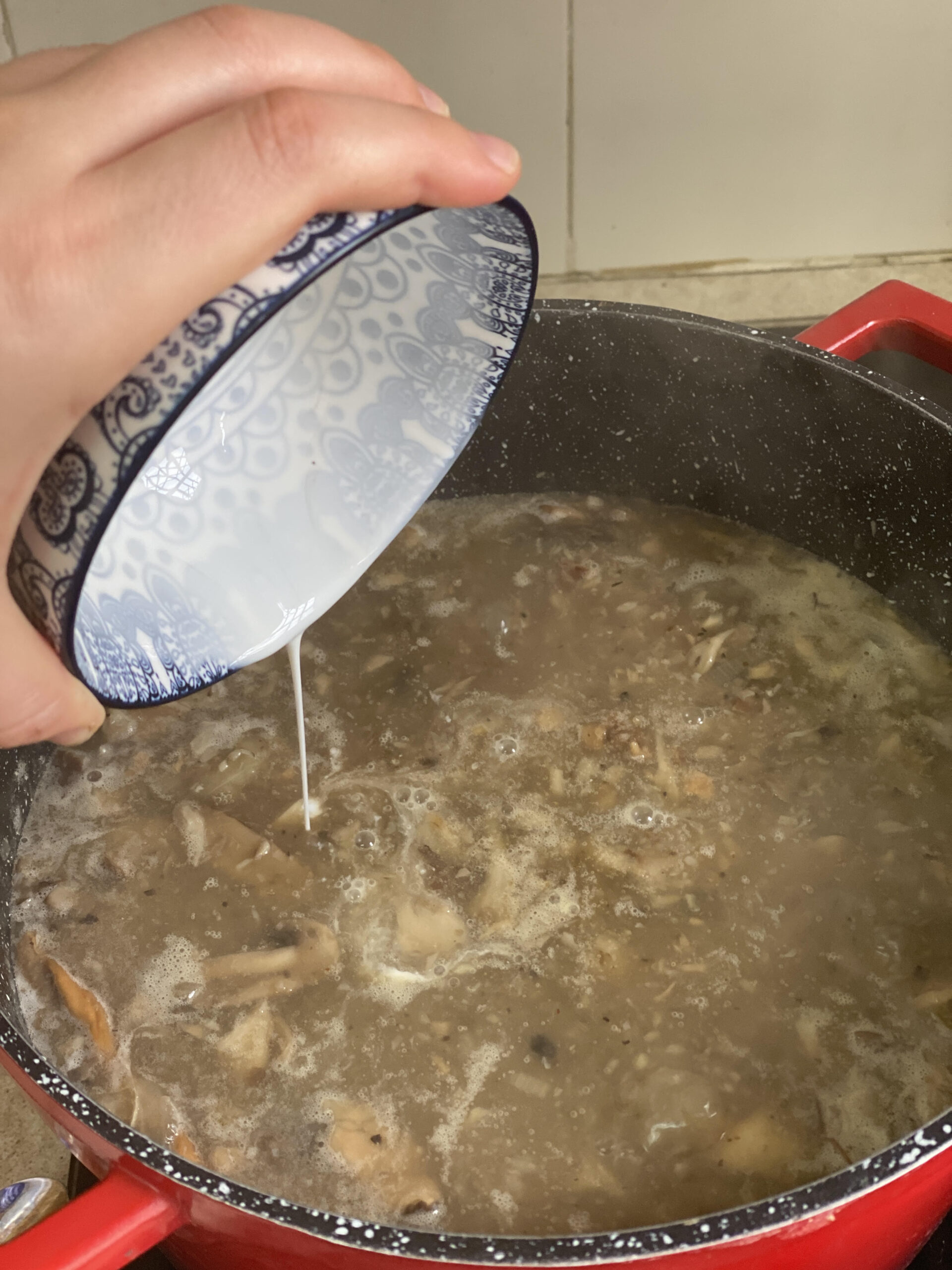 - מוסיפים את הקמח ומערבבים, לאט לאט הפטריות יסמיכו ויהיו יותר דביקות. המשיכו לערבב עד שאין יותר קמח. הוסיפו את המים/ ציר ביחד עם נוזל ההשרייה של הפטריות.