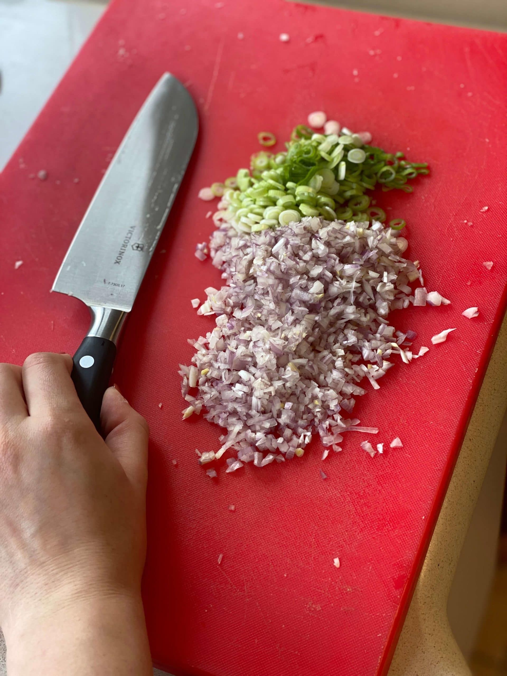 - קוצצים את השאלוט ואת הבצל הירוק קטן קטן