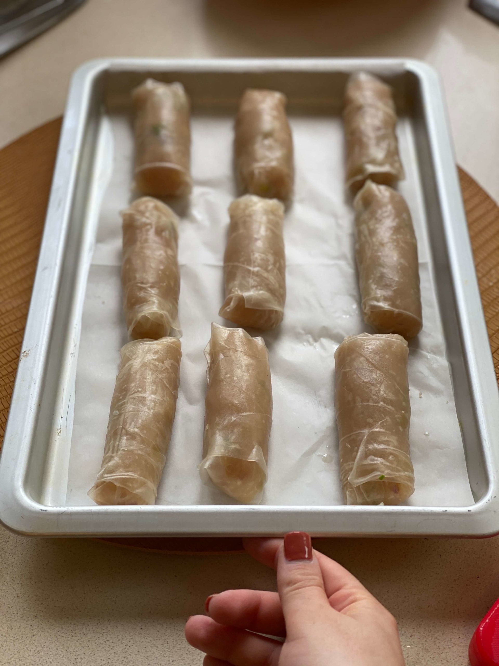 - מסדרים את הספרינג רולס במגש עם נייר אפייה ושולחים למקרר ל-10 דקות. כדי שהם יתייבשו.