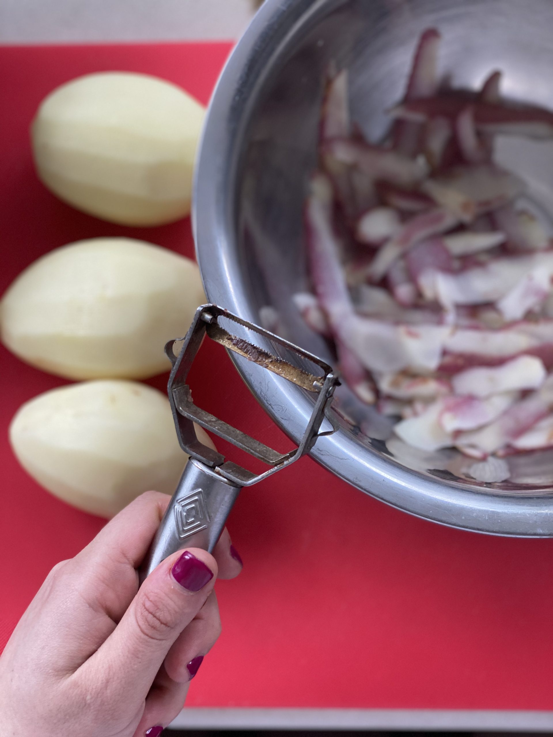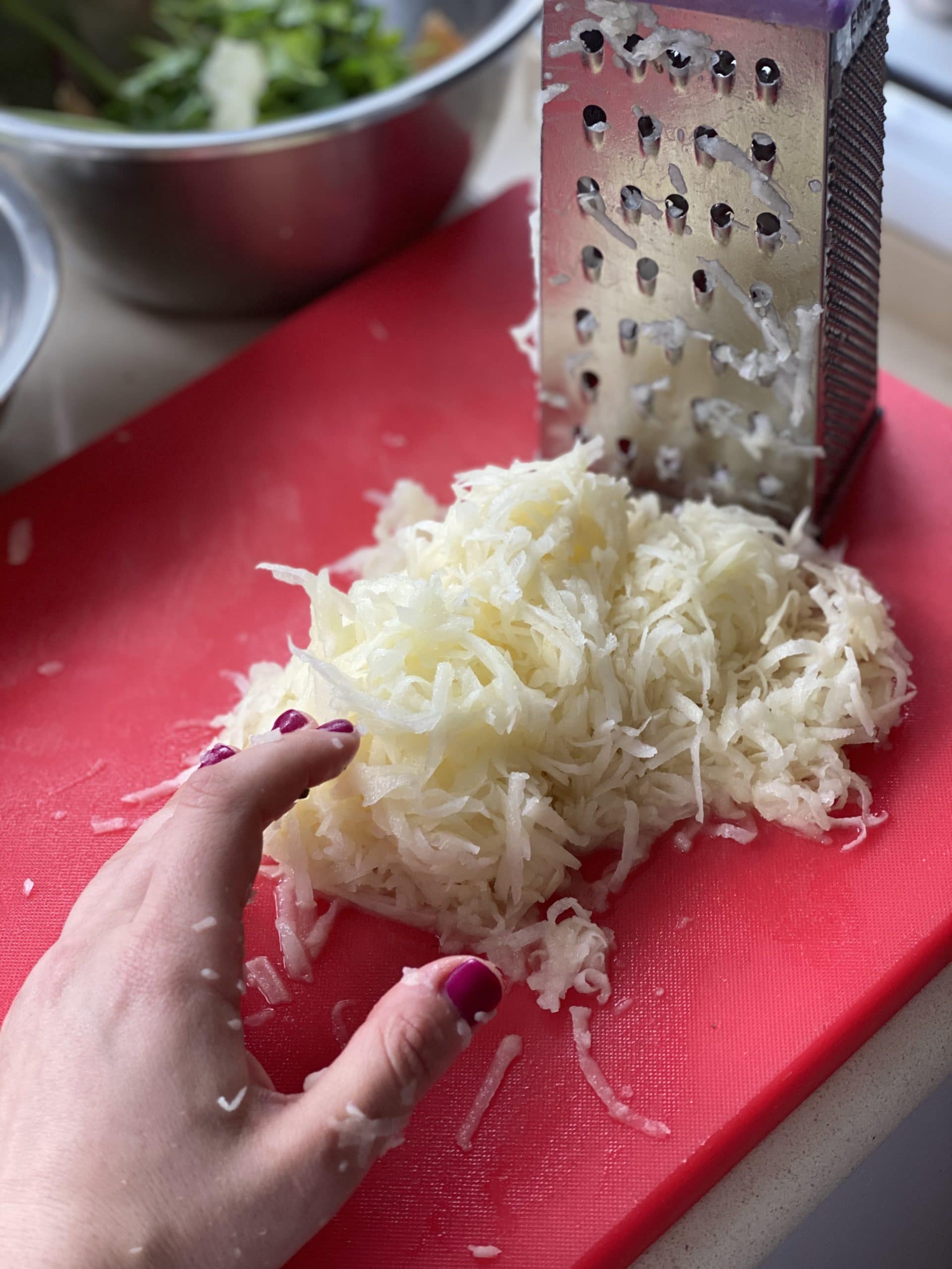 - מקלפים את התפו״א ואת הבצל ומגרדים בפומפיה לחוטים.