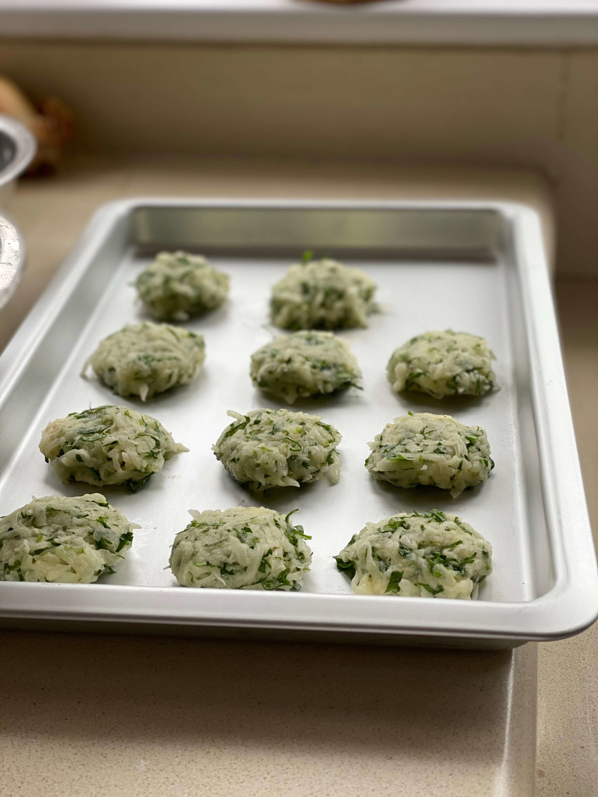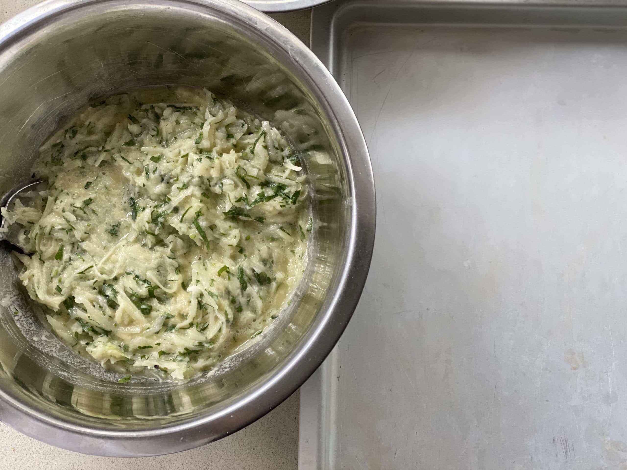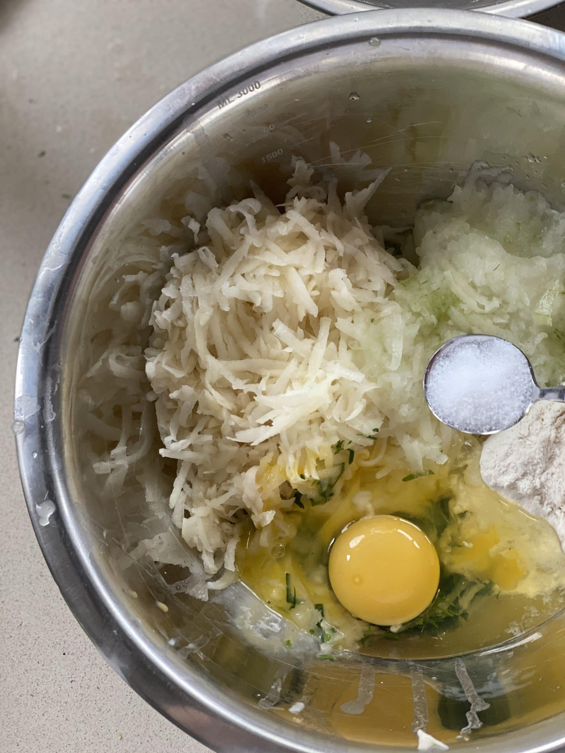 כל מה שתצטרכו זה תפו"א, בצל לבן, פטרוזיליה, קמח, ביצים, מלח ופלפל. אמאלה זה פשוט וטעים למות. אני אוהבת לשלב בתוך חלה טעימה או פשוט עם דיפ של שמנת חמוצה, שום, לימון, מלח ועירית קצוצה דק. זה מושלם בכל ארוחה כמנה ראשונה או ליד גבינות וירקות חתוכים.