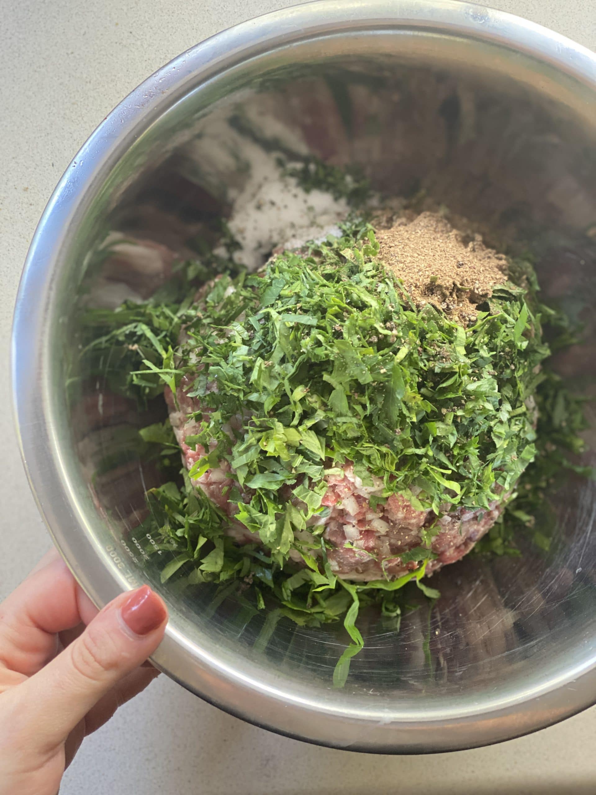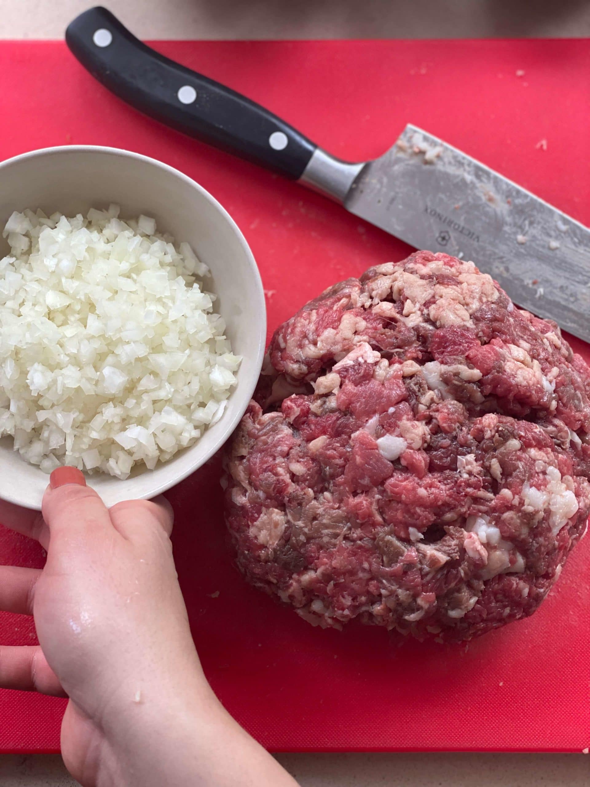 - מתחילים מלקצוץ את הבצל. עדיף לקצוץ כמה שיותר קטן. תוכלו לקצוץ ישר אחרי זה גם את הפטרוזיליה, שימו לב לא לעבור עליה כמה פעמים שלא תשחיר, רק כשהיא מעורבבת עם הבשר.