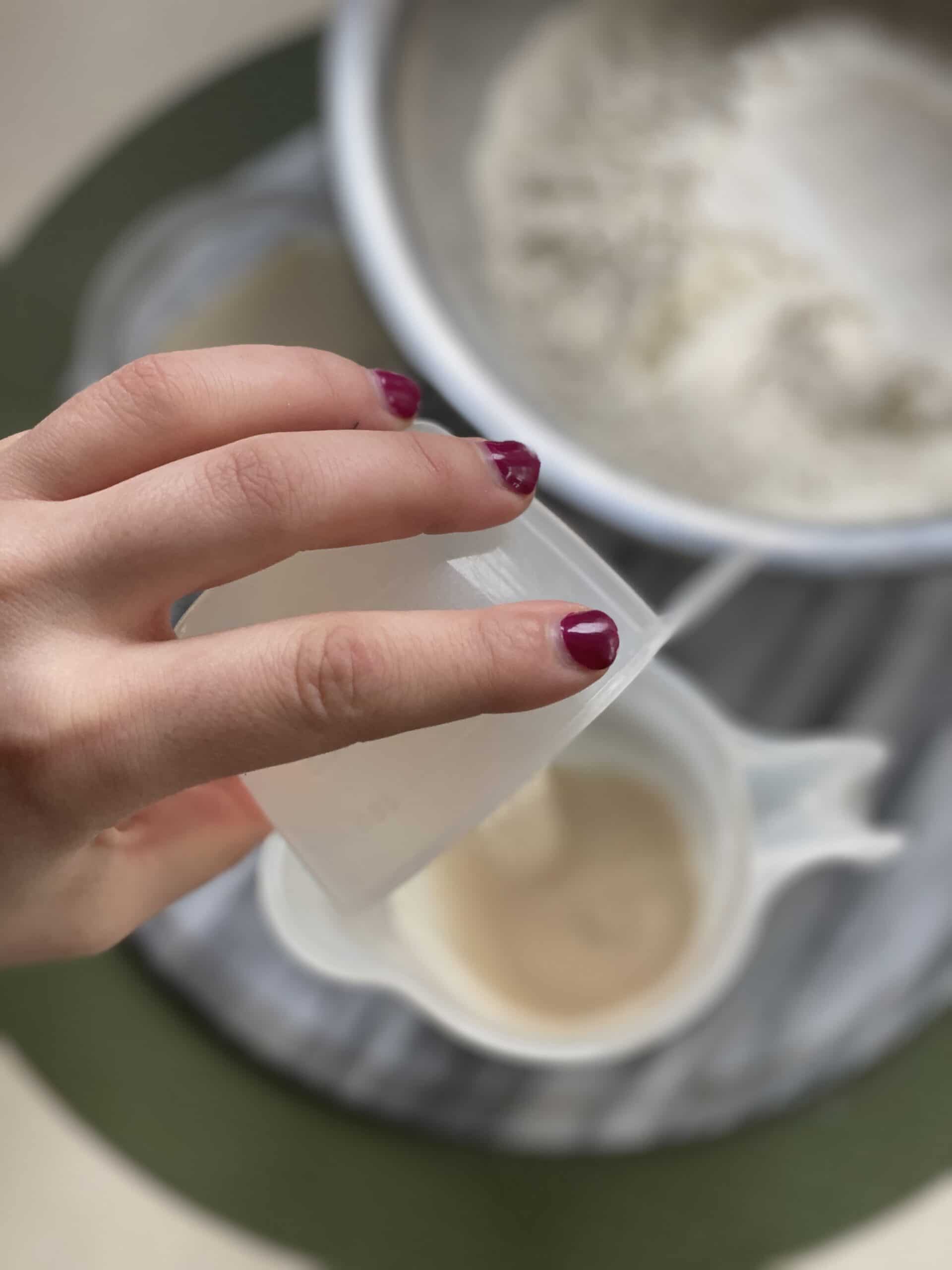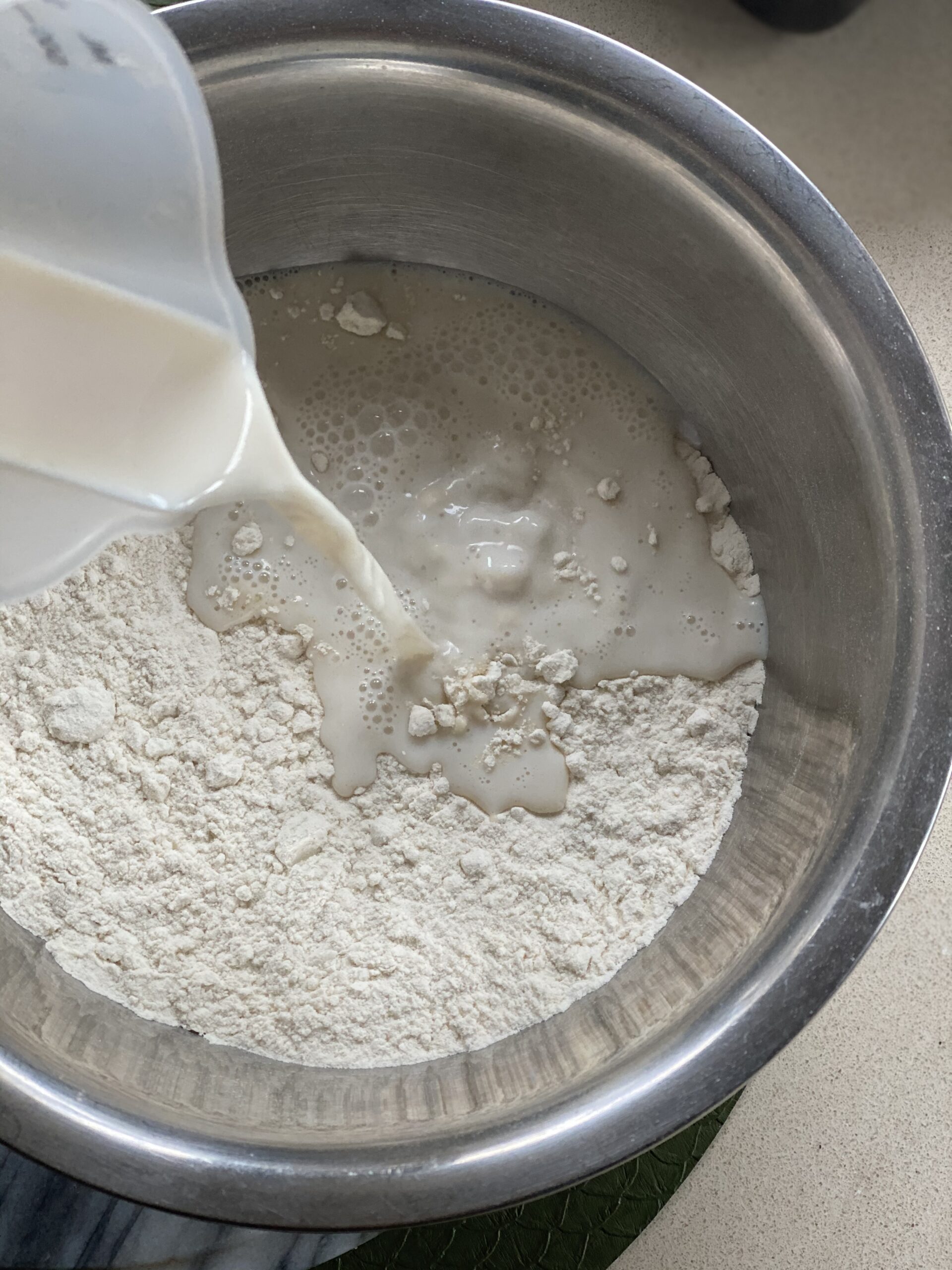 1. מחממים מעט את החלב מבלי להרתיח אותו, מוסיפים סוכר ומערבבים. שימו לב שהחלב צריך להיות באזור ה30-40 מעלות. אם אתם יכולים להכניס את האצבע ל5 שניות מבלי שיהיה חם מדי או קר מדי זאת הטמפרטורה. לחלב אתם מוסיפים את השמרים, מערבבים עם מטרפה ומשהים ל10 דק'