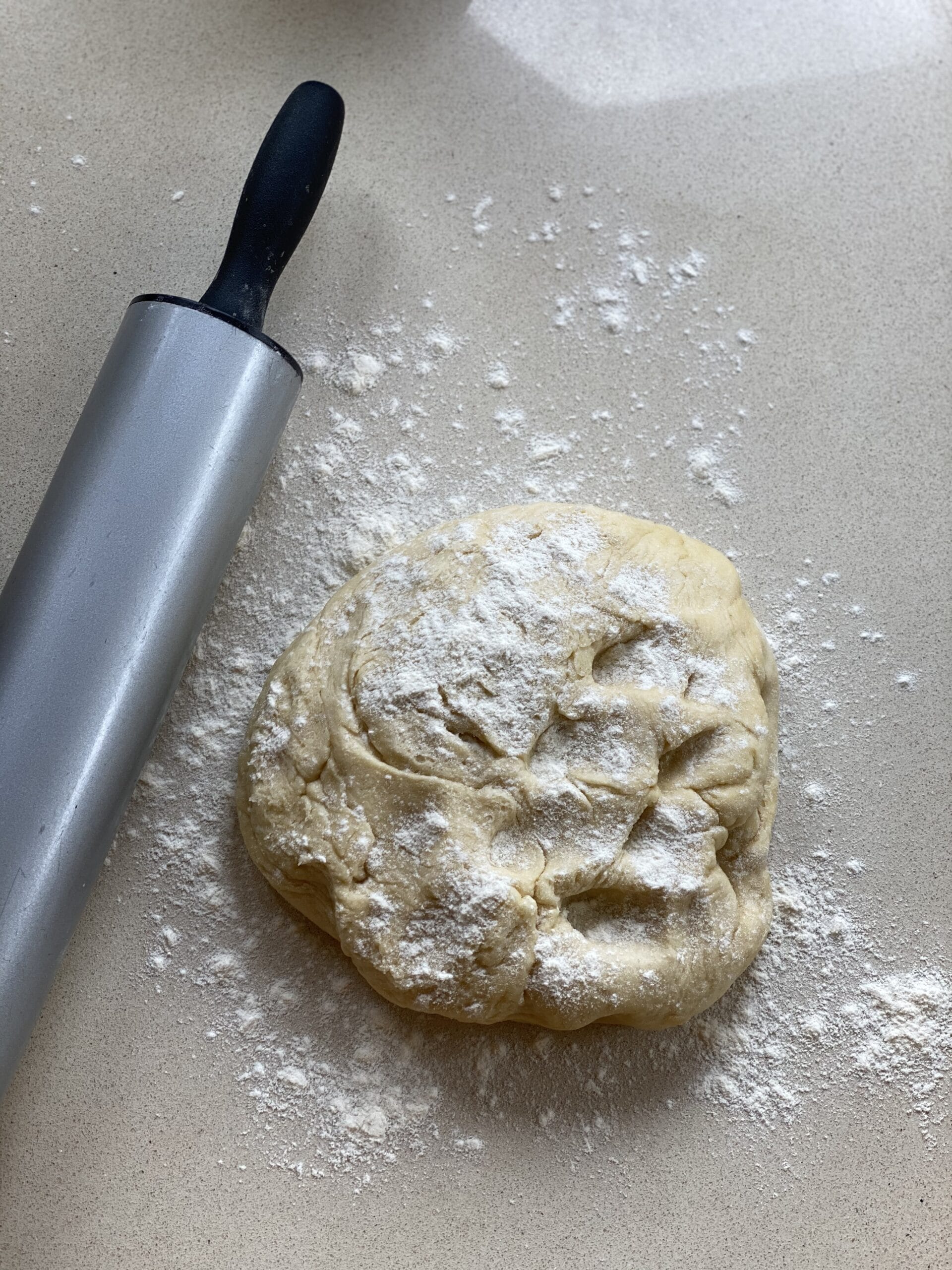 3. כאשר הבצק תפח מוציאים את האוויר ממנו, מחלקים את הבצק ל-2 ומרדדים כל פעם חצי עם מערוך ומעט קמח לצורת ריבוע. שימו לב שיש לקמח בתחתית ומעל ולפתוח בזהירות ובצורה אחידה מכל הכיוונים. את החצי הנותר מכסים במגבת עד לשימוש בו.