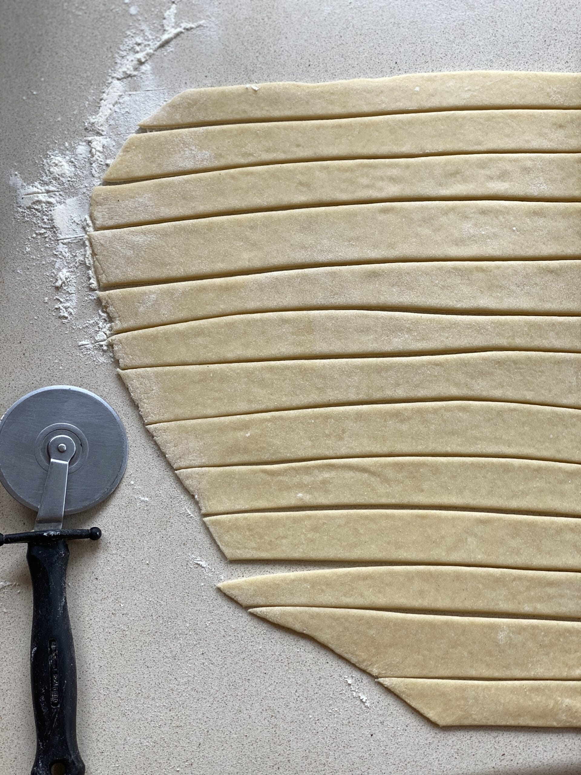 4. חותכים את הריבוע לרצועות בעזרת סכין או גלגלת פיצה.