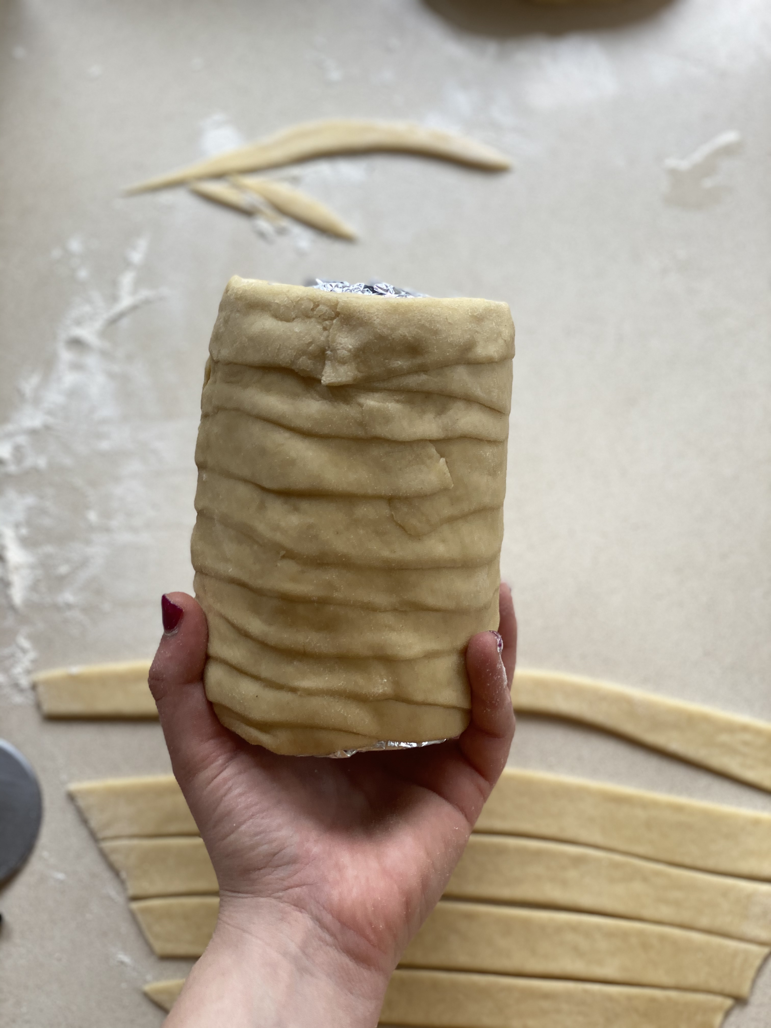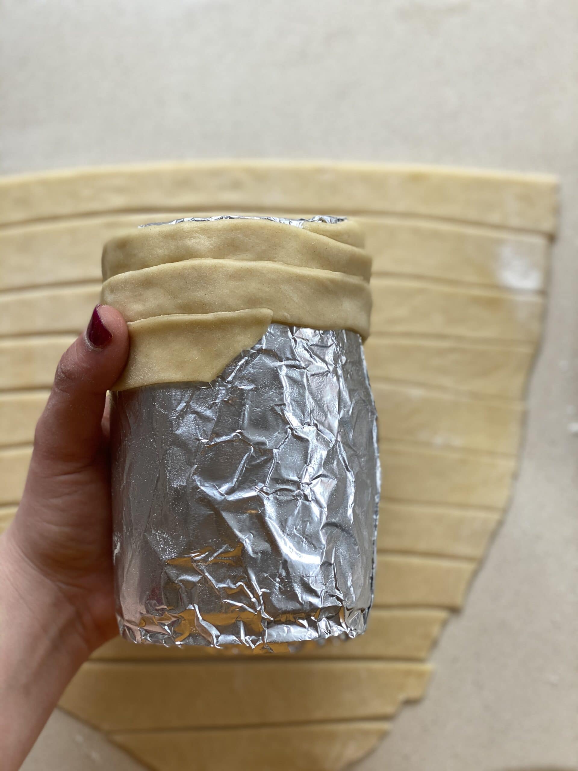 5. לוקחים את הכלי שעטפנו בנייר כסף ומשמנים אותו מכל הכיוונים. מתחילים להוסיף רצועות בצק ולעטוף אותו צמוד