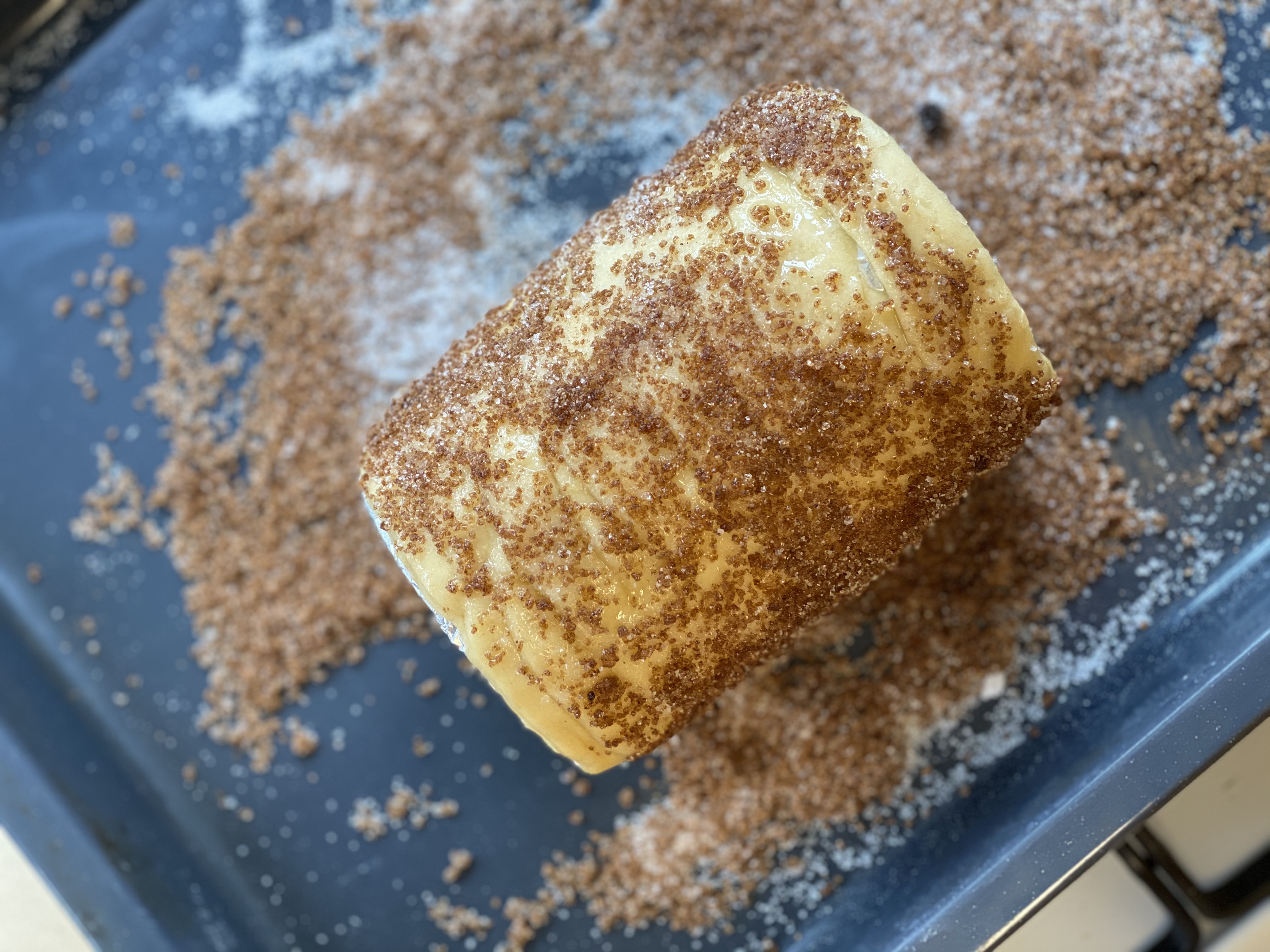 7. מכינים תערובת של סוכר לבן, חום וקינמון ומעבירים למגש שטוח. ממיסים חמאה במקביל. בעזרת מברשת סיליקון מברישים בחמאה מכל הכיוונים את הקיורטוש ומגלגלים בתערובת הסוכר והקינמון.