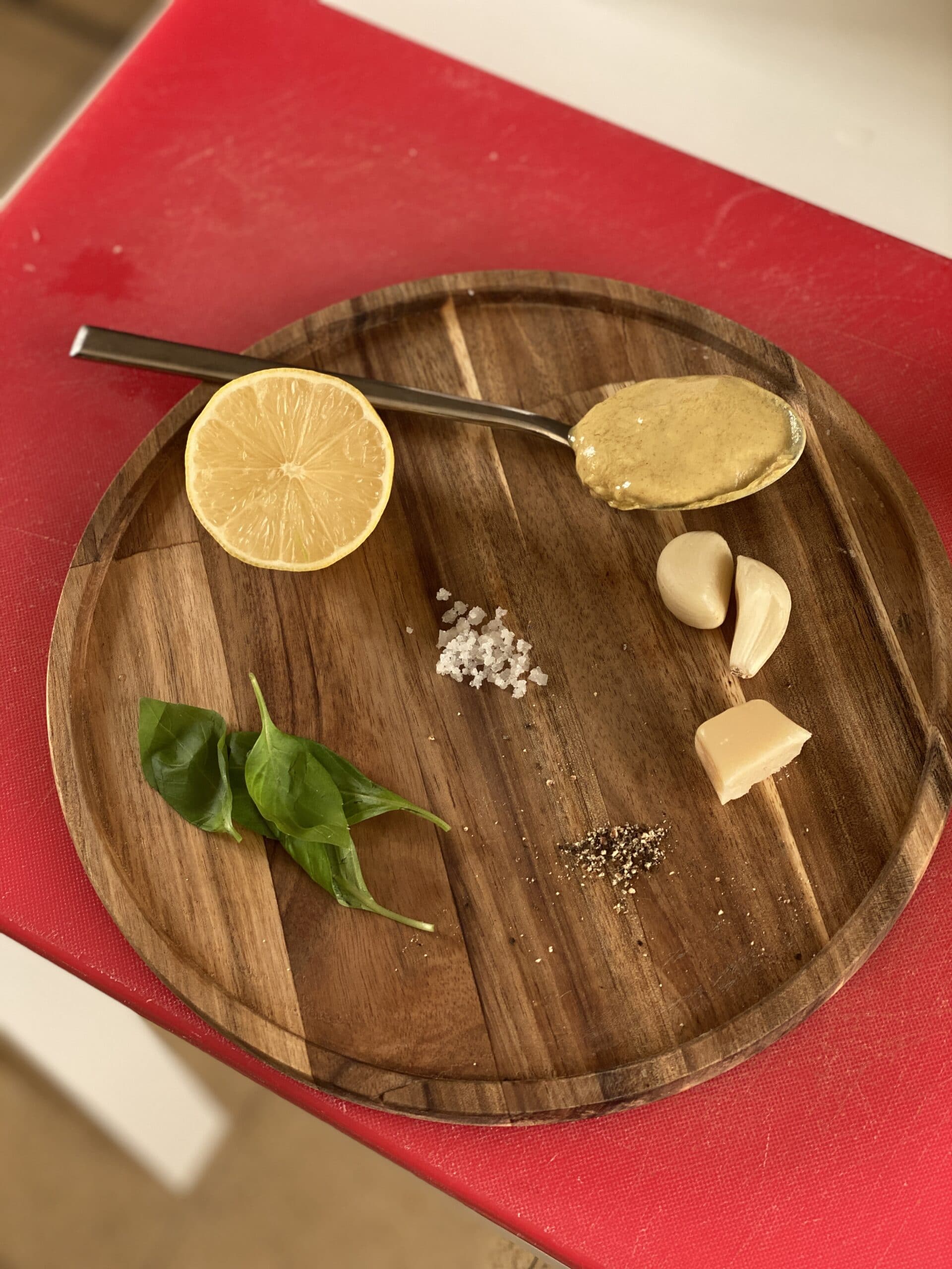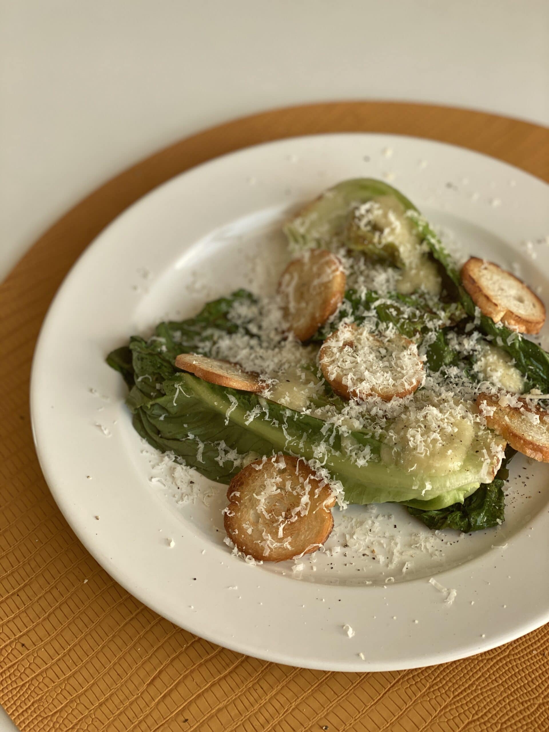 בחרתי שלא לשים אנשובי או רוטב ווסטרשייר, כדי שיהיה טעם קליל ופיציתי על זה בפרמזן. התוספת שלי לסלט היא בזיליקום.