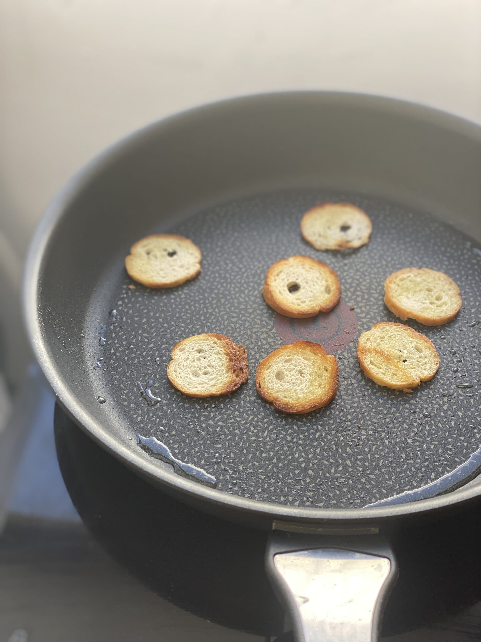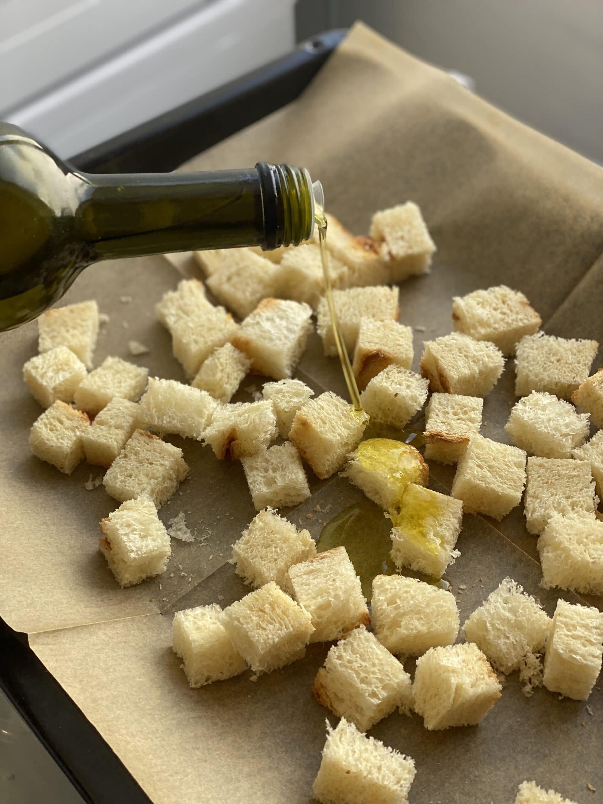 - חותכים את הבאגט דק וקולים במחבת עם שמן זית משני הצדדים או שלוקחים חלה בת יום לפחות וחותכים לקוביות וקולים בתנור על 120 מעלות לפחות ל10-15 דק'