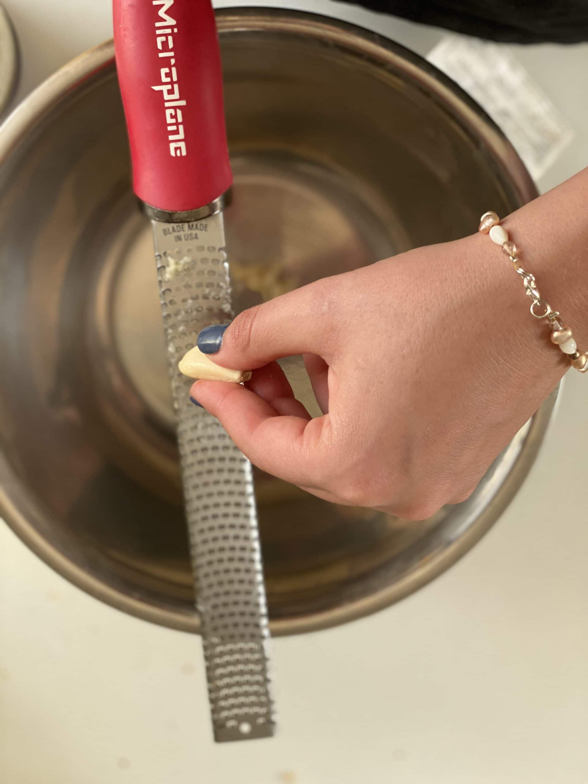 - בקערה מגרדים שום ופרמזן ומוסיפים את כל המרכיבים מלבד השמן והבזיליקום.