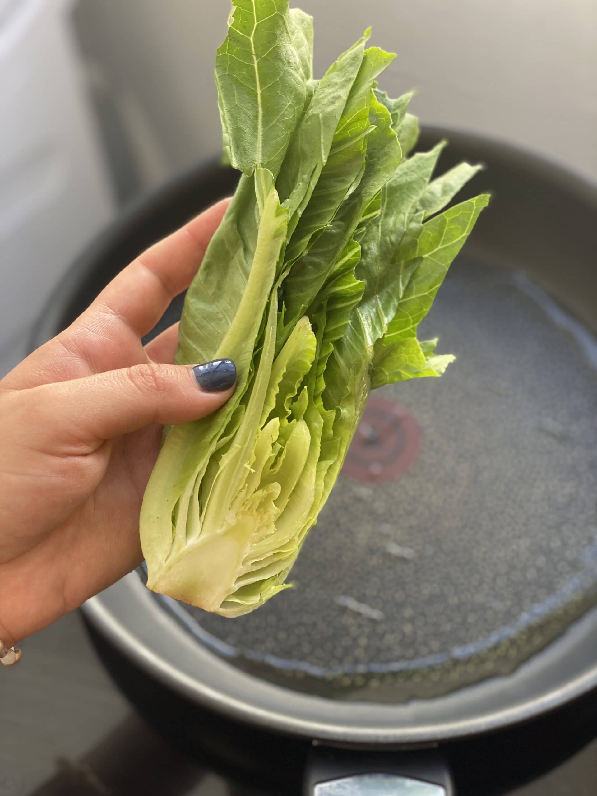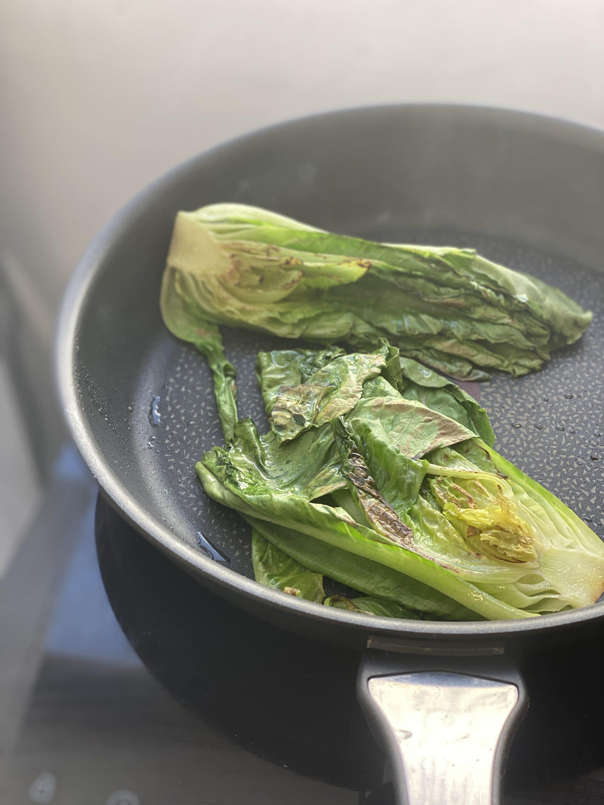 - חוצים את החסה ל-2 ומתחילים לצרוב אותה במחבת עם שמן זית חם. כשיש לה צבע מכבים את האש.