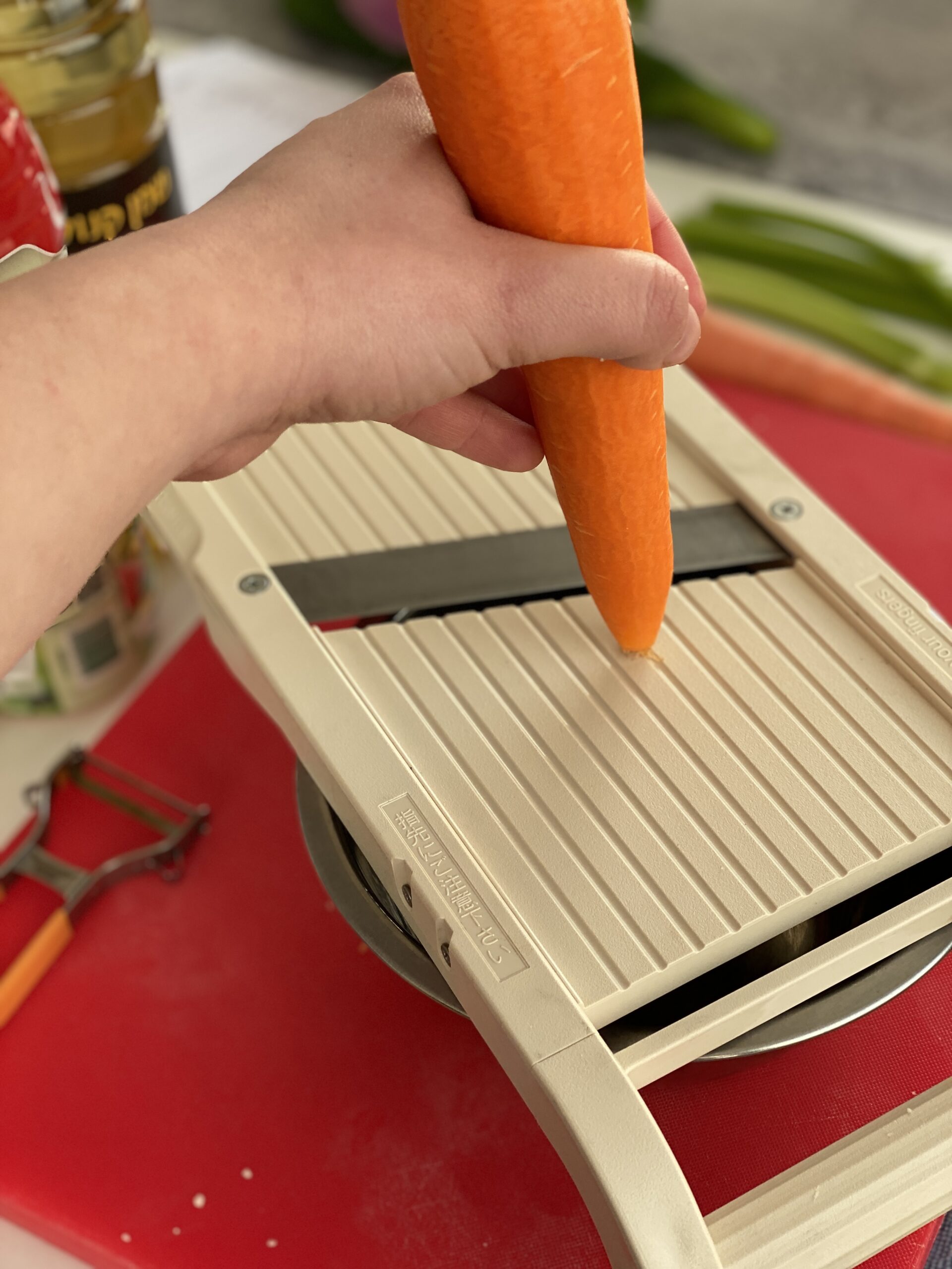 - מקלפים את הגזר ופורסים אותו דק לעיגולים