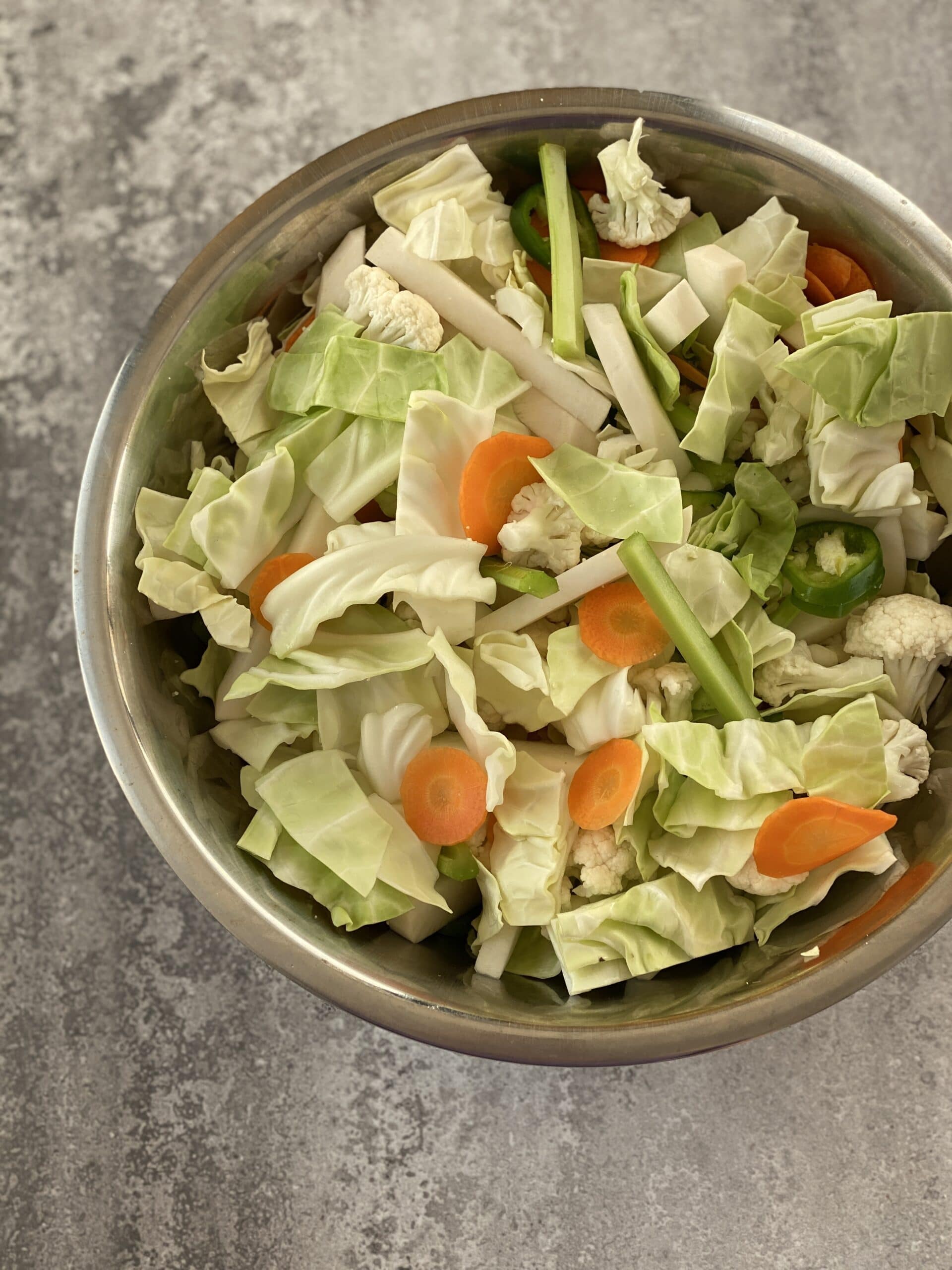 - את הכרוב חותכים לקוביות, את הסלרי למקטעים ללא העלים, את השום חוצים(אני הורדתי גם את הקצה), את הלפת קילפתי וחתכתי לקוביות, את הפלפל החריף לטבעות